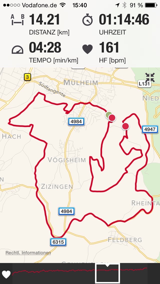 Die StreckenĂŒbersicht wird sehr genau angezeigt. Im unteren Bereich kann mit dem Finger durch ziehen des weißen Vierecks die Strecke abgefahren werden, gleichzeitig wandert ein roter Punkt ĂŒber die Lauflinie. Im oberen Bereich Ă€ndern sich die Daten entsprechend.